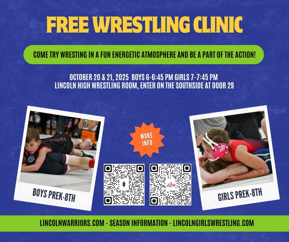 Lincoln Girls Wrestling and Lincoln Warriors are offering a free wrestling clinic to anyone interested in attending and/or finding out more about wrestling. Boys will practice 6-6:45 and Girls will practice 7-7:45 different material will be covered each night. There is no cost for the clinic but participants do need to complete a waiver online. The clinic will be held in the Lincoln High School wrestling room, please enter through door 29 on the South side of the building.